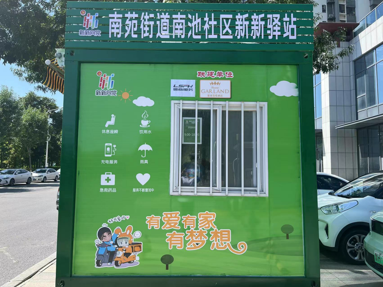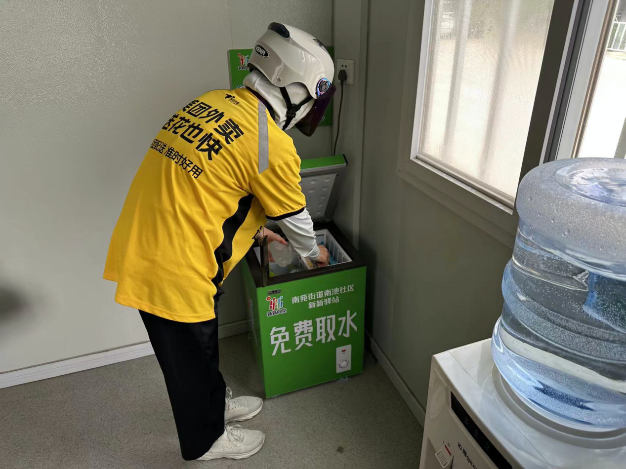“新新驛站”是將閑置的核酸采樣亭進行煥新改造,內(nèi)設空調(diào)、冰箱、飲水機、座椅、充電器、雨傘、急救藥品箱、打氣筒、花露水、血壓計等便民設施及物品,為小區(qū)業(yè)主、快遞員、出租車司機、環(huán)衛(wèi)工人及外賣員提供便利服務和休息場所。