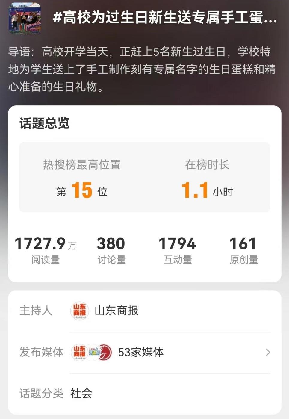 學(xué)校還為9月9日集中報(bào)到日當(dāng)天過(guò)生日的學(xué)生送上了生日蛋糕,蛋糕由西餐學(xué)院的老師親手制作,并刻有過(guò)生日學(xué)生的名字,相關(guān)視頻經(jīng)媒體報(bào)道后迅速登上煙臺(tái)同城熱搜第1位,全國(guó)熱搜第15位,瀏覽量超2000萬(wàn)。