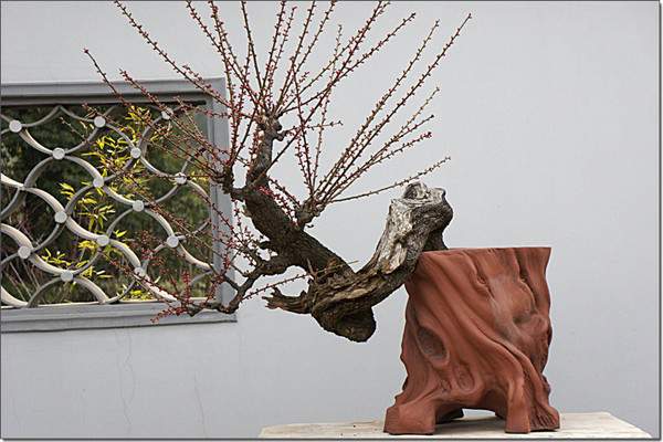 紅梅耐整形修剪,發(fā)枝力強(qiáng),花芽形成甚易,故特適盆景栽培。盆栽紅梅澆水要適度,太多易落黃葉,太干易落青葉,都可造成大害。但新技長至所需長度(30厘米左
