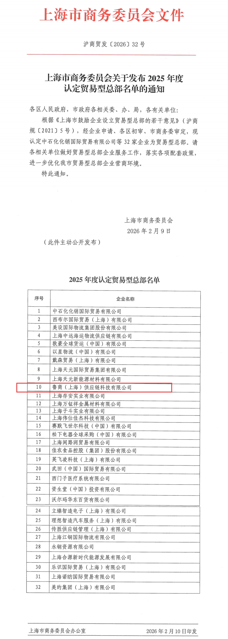 近日,上海市商務(wù)委員會(huì)正式公布了2025年度認(rèn)定的32家貿(mào)易型總部名單,魯商(上海)供應(yīng)鏈科技有限公司憑借穩(wěn)健的業(yè)務(wù)基礎(chǔ)、良好的行業(yè)積淀與成熟的綜合服務(wù)能力成功入選。