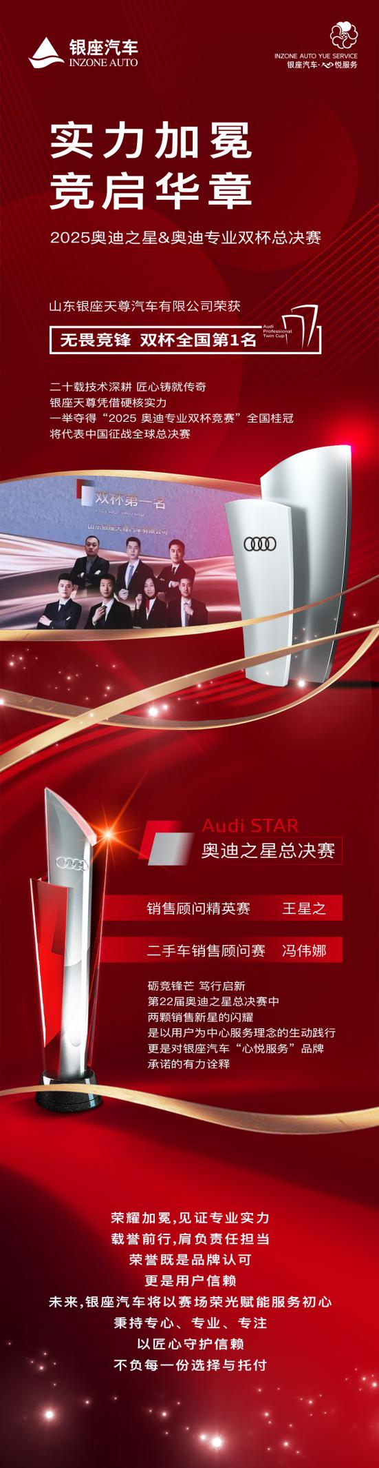 在同步舉行的第22屆奧迪之星總決賽中,銷售顧問王星之、二手車銷售顧問馮偉娜憑借對產(chǎn)品的深度理解、對客戶需求的精準把握,雙雙榮獲“奧迪之星”精英稱號。雙星同臺閃耀,不僅是個人能力的充分彰顯,更是銀座汽車以用戶為中心服務理念的生動踐行,也印證了銀座汽車“心悅服務”品牌對用戶的鄭重承諾。