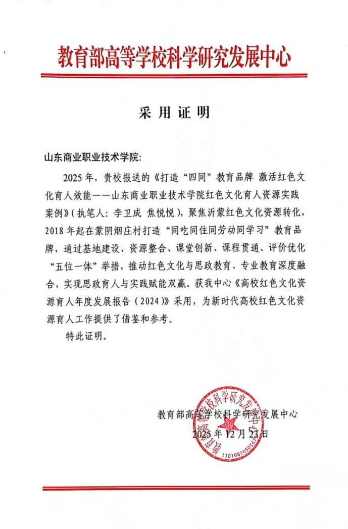 近日,山東商職學院報送的《打造“四同”教育品牌 激活紅色文化育人效能——山東商業(yè)職業(yè)技術學院紅色文化育人資源實踐案例》成功入選教育部高等學??茖W研究發(fā)展中心《高校紅色文化資源育人年度發(fā)展報告(2024)》,為新時代高校紅色文化資源育人工作提供了借鑒和參考。