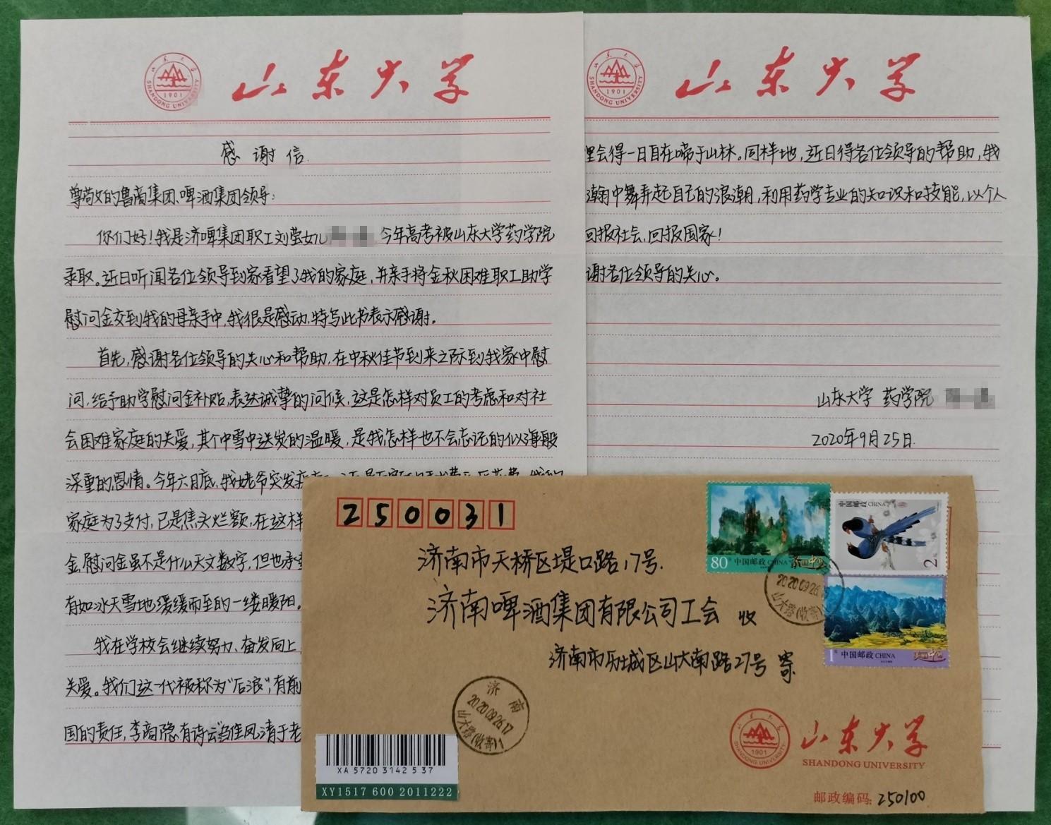 9月27日,濟(jì)啤集團(tuán)收到困難職工劉瑩女兒從學(xué)校寄來的感謝信。