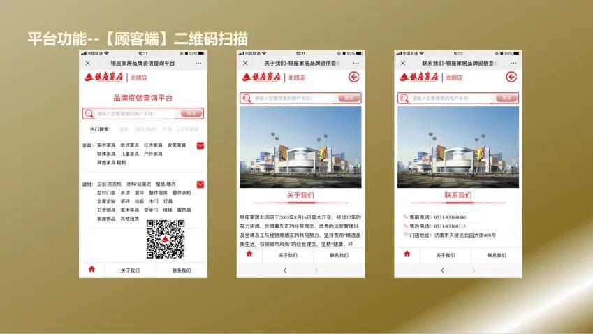 為優(yōu)化守信經營氛圍及健全商戶信用管理體系,由營運團隊自主研發(fā)搭建“商戶信用查詢平臺”,該平臺通過顧客前端與管理后端兩個端口管理支撐實現四個功能,前端消費者可通過展廳二維碼掃描隨時查看品牌經營資質,打消顧慮實現信用公開可視化;后端設定提前30天預警功能實現授權資質和工廠資質預警管理自動化,多維度有效管理控制商戶風險,引導商戶由被動管理走向自助管理。