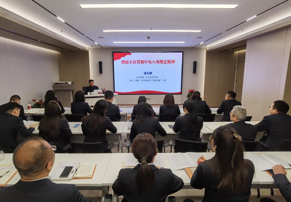 讀書班期間,全員通過集中學(xué)習(xí)、個人自學(xué)和分組交流研討等方式,認(rèn)真學(xué)習(xí)了習(xí)近平總書記關(guān)于加強黨的作風(fēng)建設(shè)的重要論述和中央八項規(guī)定及其實施細(xì)則精神,中共山東省委黨校(山東行政學(xué)院)成長群教授作《鍥而不舍貫徹中央八項規(guī)定精神》專題授課。
